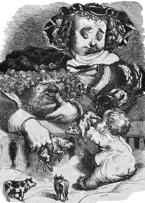 Et alors, en souriant, il détacha sa belle braguette et, tirant à l’air sa mentule, les compissa si aigrement qu’il en noya deux cent soixante mille quatre cent dix-huit, sans compter les femmes et les petits enfants.