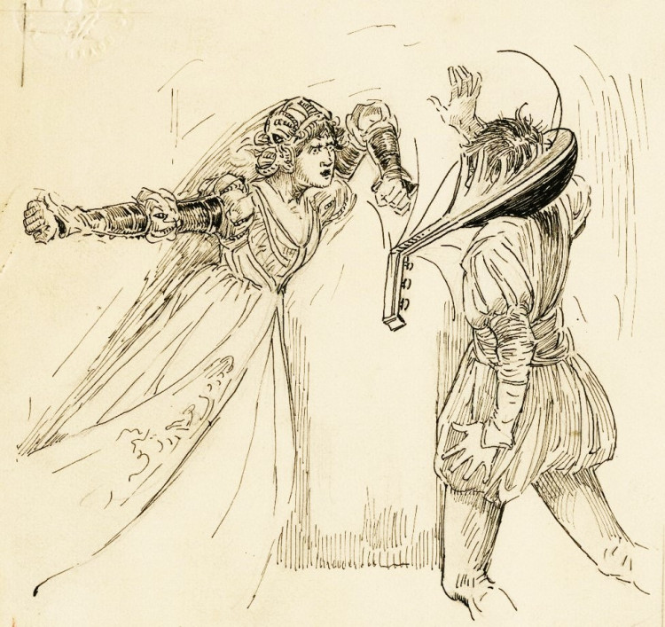 Grumio – Erreur dans la note, l’ami, erreur dans la note ! J’ai demandé que les manches soient découpées, et ensuite cousues. Cela je le maintiendrai mordicus, même si ton petit doigt était armé d’un dé !